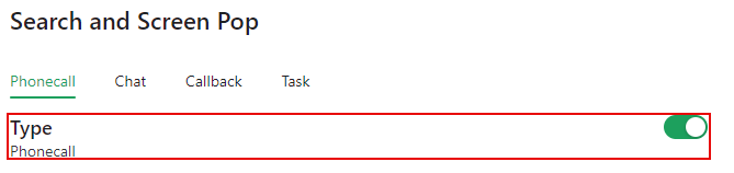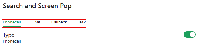 With the interaction type selected, enable or disable the Search and Screen Pop feature by toggling the slider to the on or off position. This feature must be enabled to configure screen pops.