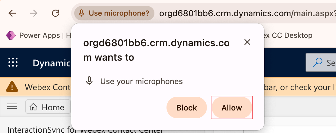 When you select the Desktop telephony option, the web browser prompts you to allow microphone access after you click the Submit button. You must accept this prompt to take calls.