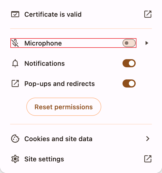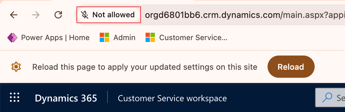 If you miss the prompt, look for a Disabled Microphone icon or microphone Not allowed button next to the URL at the top of the browser window to re-display the prompt.