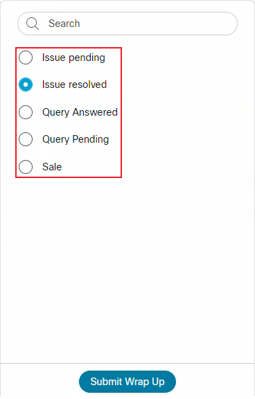 - Select from a list of reasons to use for the wrap up, and click the Submit Wrap Up button when finished.