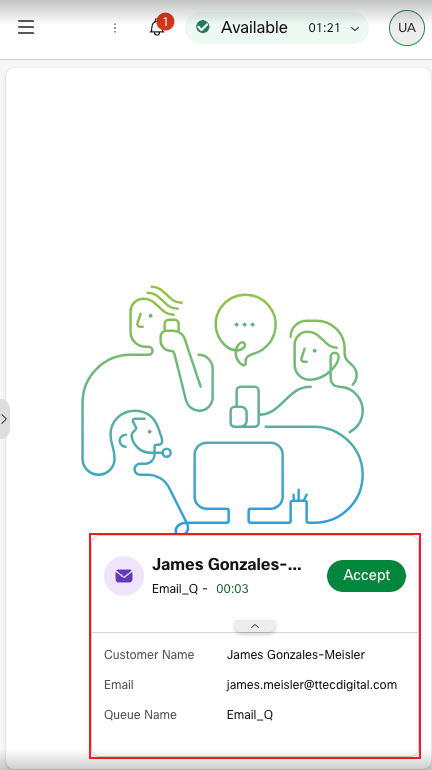 - Contact Attributes: If your contact center administrator has enabled this feature, contact attributes display key customer details directly within the chat notification or interaction panel. This allows you to quickly understand who you are speaking with without needing to search or open additional records. Common contact attributes may include: