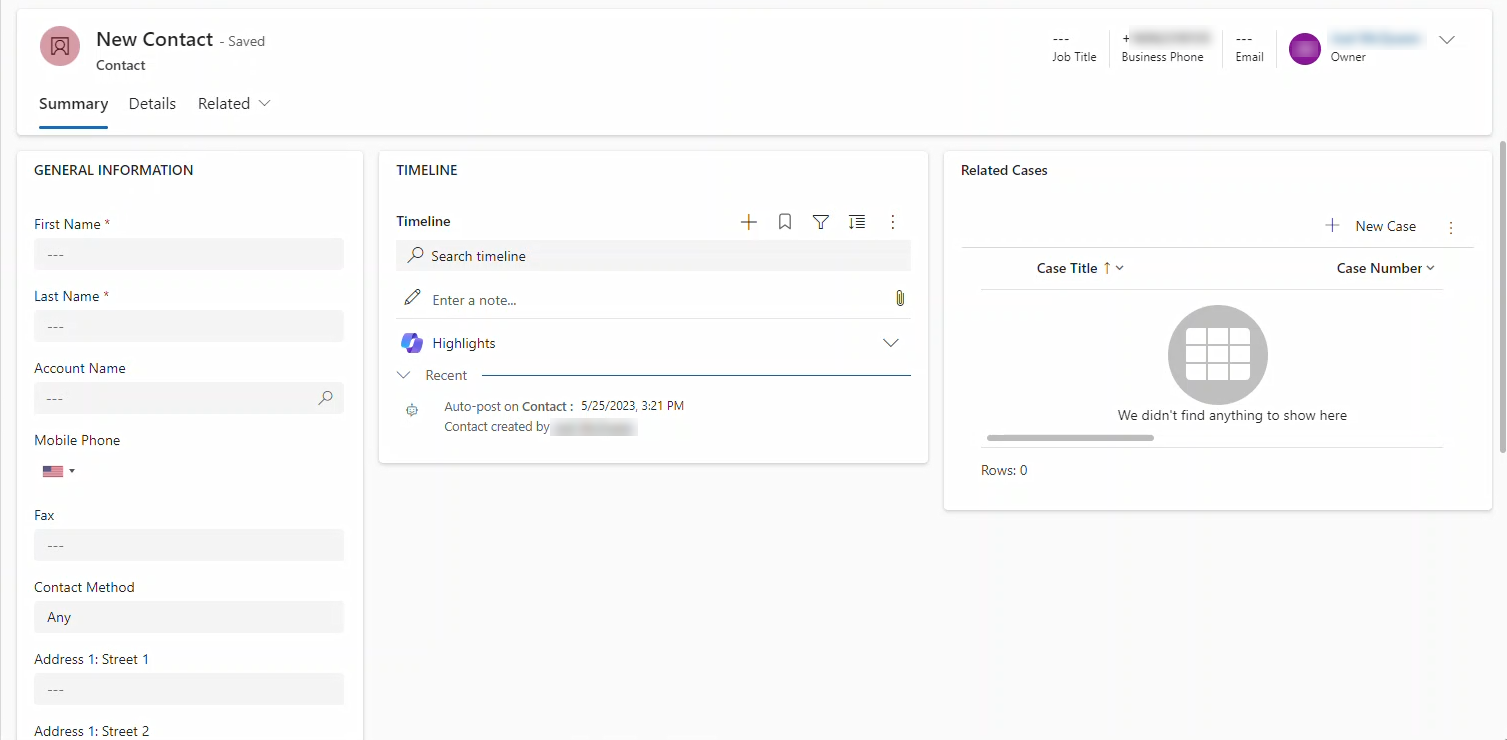 If no matches are found, InteractionSync may display a New Contact form or other New Entity form. Below is an example entity used for a entering details for a new contact. In this example, you can collect general information about the customer, such as their name, address, and phone number. After this information is collected in Dynamics 365, it is then made available to any future agents that may receive a call from this contact.