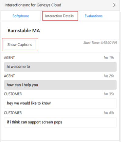 For phone calls and callbacks, the Interaction Details tab also includes a Show Captions button. Upon clicking this option, it displays live transcription during the active call. The transcription is only available while the call is in progress and disappear once the call ends.