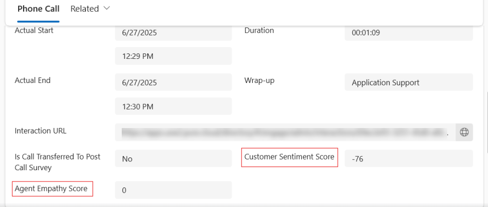 As the agent disconnects and de-allocates the call, two fields Customer Sentiment and Agent empathy Score values are displayed on the Activity Record.